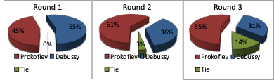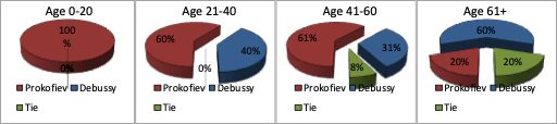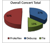 This was a very special edition of Classical Smackdown, expanded to include many different genre as part of the Arts Immersion Series at Beechwood Arts. In addition to voting on the music, the audience voted on a Poetry Slam, on visual arts inspired by Prokofiev or Debussy, films constructed on a Prokofiev or Debussy soundtrack, food presented in competing appetizer pairs, a wine-tasting and other fun stuff! You can see the results of the other voting at the Beechwood Arts website.